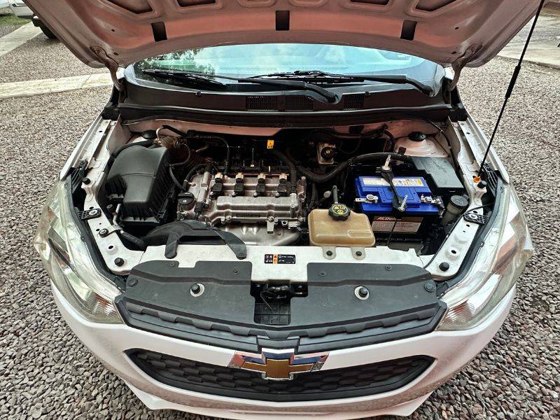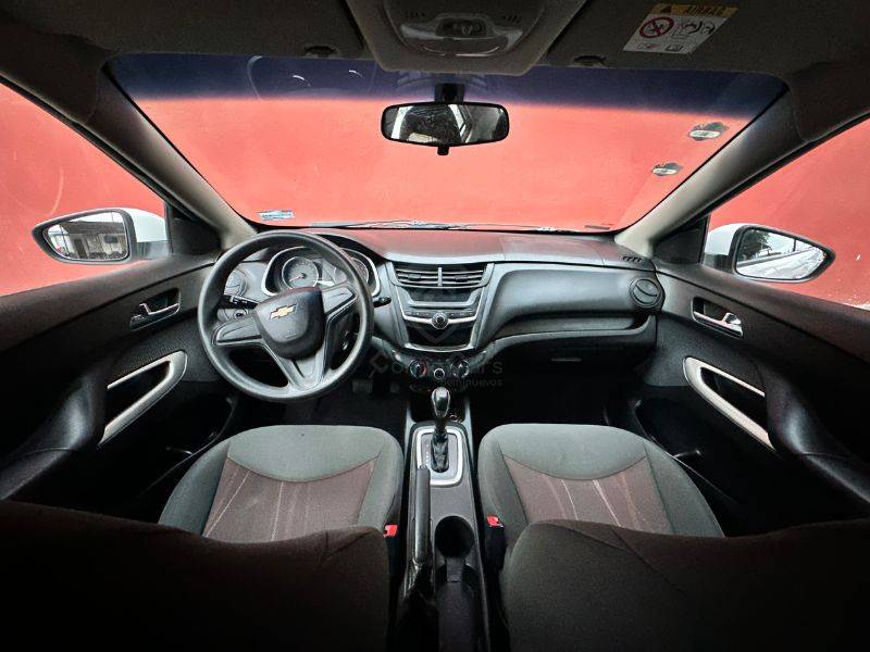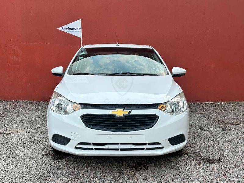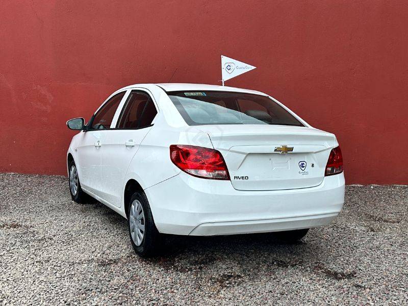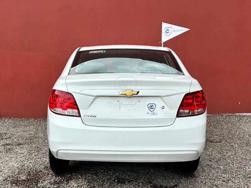 Es un vehículo de la marca Chevrolet, modelo Aveo, del año 2018, color blanco en el exterior y negro en el interior.