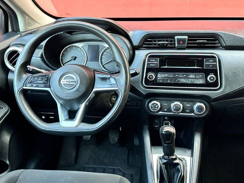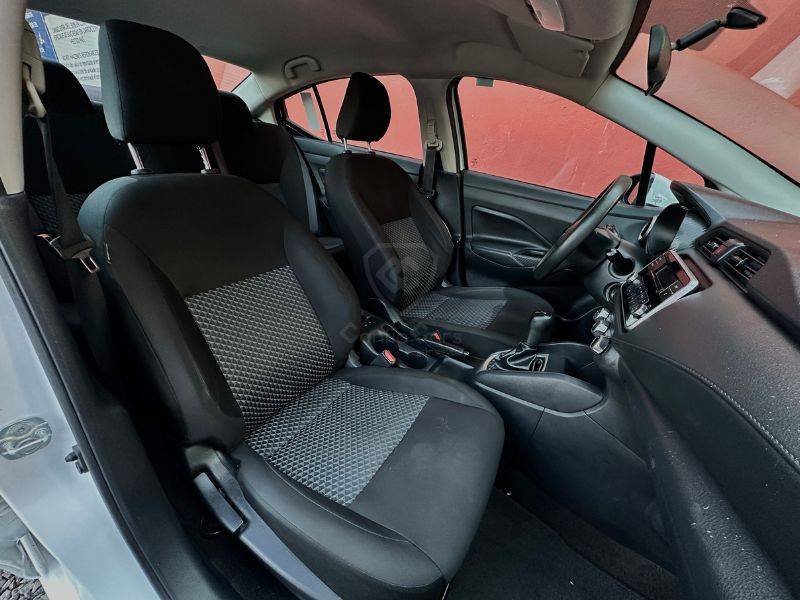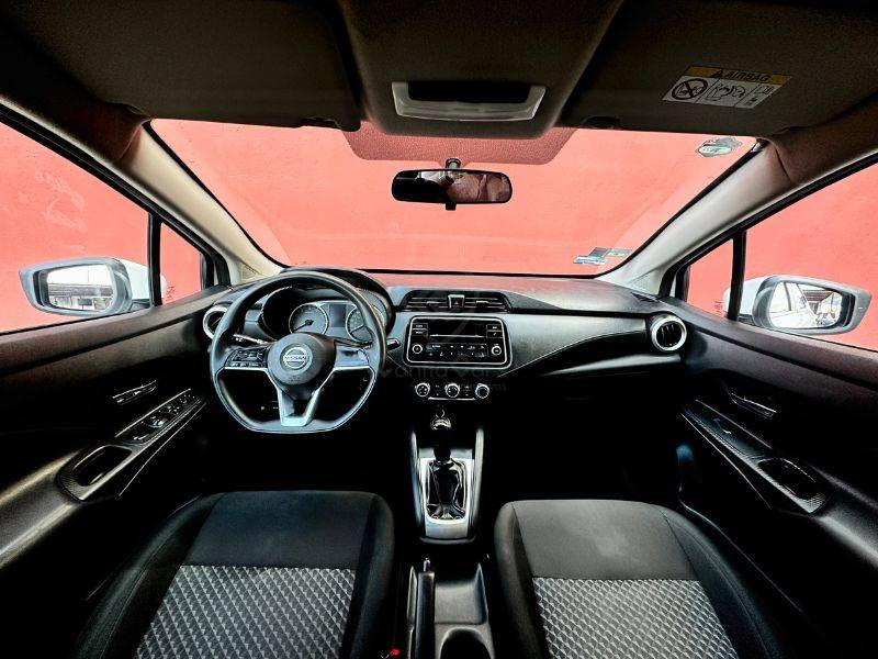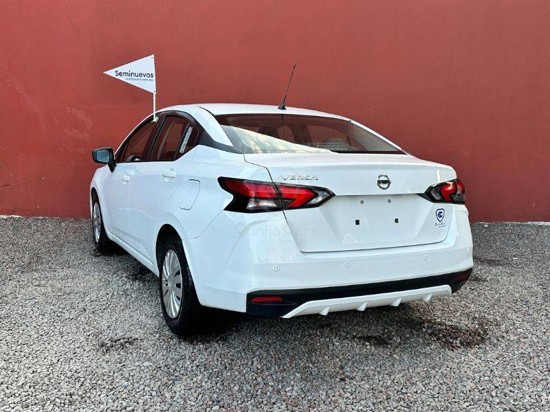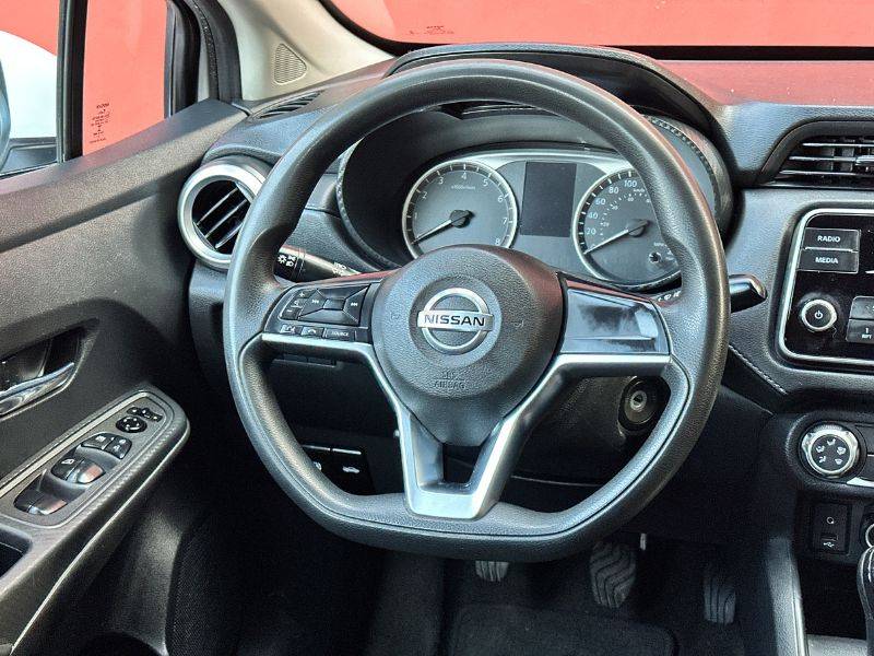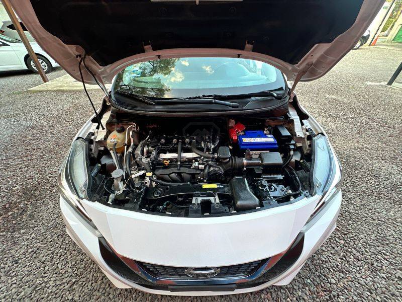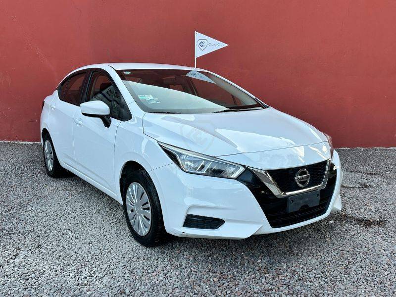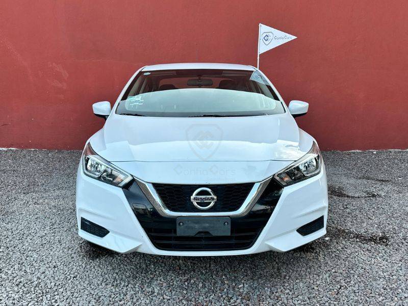 Es un vehículo de la marca Nissan, modelo Versa, del año 2021, color blanco en el exterior y negro en el interior.